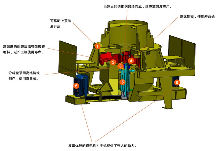 物料經(jīng)分料器將物料分成兩部分,一部分由分料器中間進入高轉(zhuǎn)速的葉輪中,在葉輪內(nèi)被迅速加速,其加速度可大數(shù)百倍重力加速度,然后以60至70米每秒的速度從葉輪三個均布的流道內(nèi)拋射出去。首先由分料器四周自收落下的一部分物料沖擊破碎,然后一起沖擊到渦支腔內(nèi)物料襯層上,被物料襯層反彈,斜向上沖擊到渦動腔的頂部,又改變其運動方向,偏轉(zhuǎn)向下運動,從葉輪流道發(fā)射出來的物料形成連續(xù)的物料幕。這樣一塊物料在渦動破碎腔內(nèi)收受到兩次以及多次幾率撞擊、摩擦和研磨破碎作用。被破碎的物料由下部排料口排出。